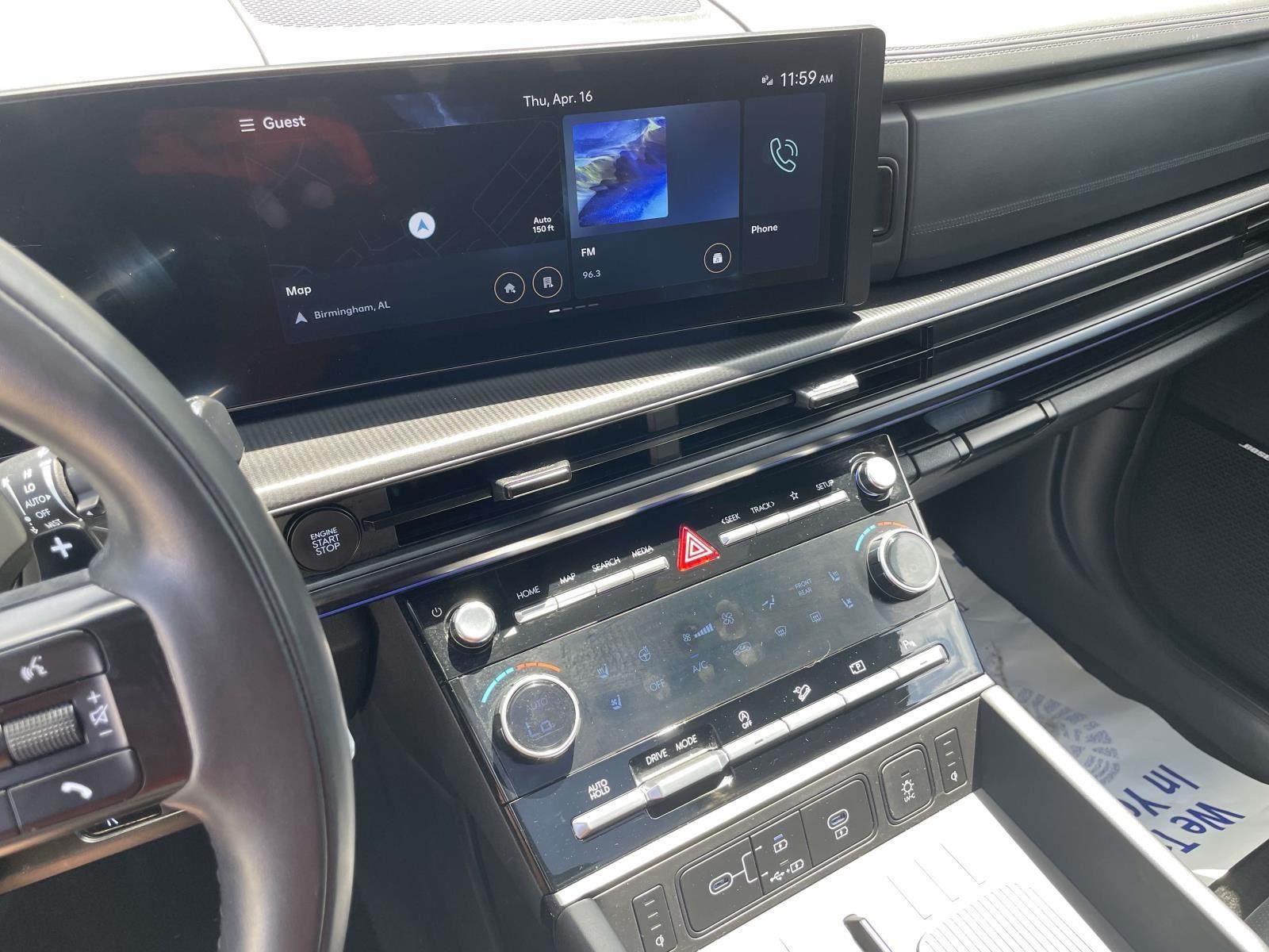 - Radio: AM/FM/HD Bose Premium Audio System -inc: 12 speakers including subwoofer, external amplifier, 12.3" wide touchscreen, Apple CarPlay and Android Auto, Bluetooth® hands-free w/wireless audio streaming, dynamic voice recognition, USB connectivity, SiriusXM, Blue Link+ connected car system, navigation system including traffic flow w/incident data via HD Radio (HERE) and rear seat quiet mode
